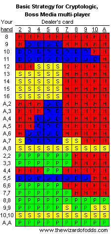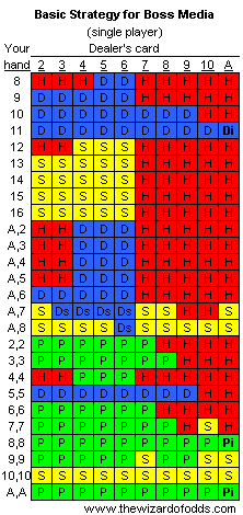 Following is the basic strategy for the single player game. To use the basic strategy look up your hand along the left vertical edge and the dealer's up card along the top. In both cases an A stands for ace. ![]() Key